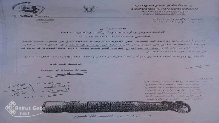 ضجت الصفحات السورية على مواقع التواصل الاجتماعي مؤخرا بتعميم قيل إنه صادر عن محافظ مدينة طرطوس السورية، يحذر فيه من وجود “أقلام ملغومة” نشرتها في المحافظة مجموعات إرهابية.