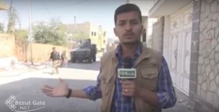 وظهر في الفيديو المراسل، وهو يتحدث أمام الكاميرا بالقرب من معسكر في شرق تعز، وخلفه تقف مدرعة وخلال ذلك انفجرت قذيفة حوثية بالقرب من المكان.