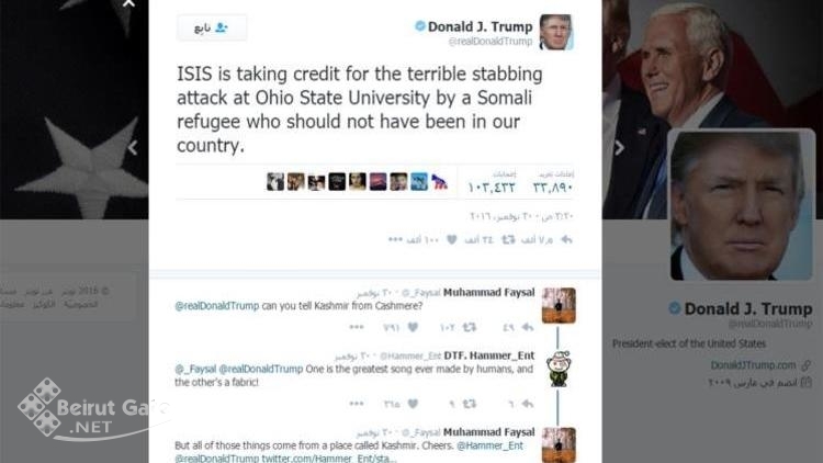 ويستخدم ترمب موقع تويتر على نطاق واسع لنشر أفكاره، وكان من بين آخر تغريداته قوله إن عبد الرزاق علي أرتان الذي نفذ هجوما أسفر عن إصابة 11 طالبا في جامعة ولاية أوهايو الاثنين الماضي “لا ينبغي أن يكون في بلدنا”، وذلك رغم أن أرتان مقيم بصورة قانونية في الولايات المتحدة، وكان قد وصل في عام 2014.