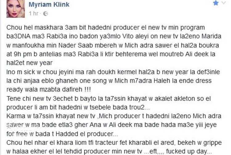 كشفت عارضة الأزياء ميريام كلينك عن تلقيها تهديداً من منتجة برنامج “وبعدنا مع رابعة” بوضع “فيتو” على إسمها داخل قناة “الجديد” وذلك بعدما رفضت تصوير حلقة ليلة رأس السنة التي تقدّمها الإعلامية رابعة الزيات ويحلّ فيها ضيفاً الفنان علي الديك.