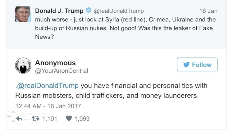 وبعث حساب مجهول لهؤلاء القراصنة بهذه التهديدات إلى ترامب عبر شبكة التواصل الاجتماعي “تويتر”، التي ينشط عليها الرئيس الأميركي ذاته، حيث وجهوا حديثهم له بأنهم سينشرون فضائحه الجنسية وبعض أسراره الموجودة لدى روسيا، فيما قالت جريدة “مترو” البريطانية إن حساب “تويتر” الذي أطلق التهديد معروف بارتباطه بقراصنة إنترنت.
