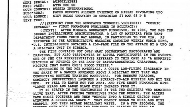 ويشير التقرير، إلى أن تقرير “سي آي إيه” المذكور، الذي أعد في 27 آذار عام 1993، هو ترجمة من وكالة الاستخبارات المركزية لتقرير من الصحيفة الأوكرانية “Ternopil vechirniy”، حيث قال تقرير الصحيفة إنه بعد فقدان ميخائيل غورباتشوف السلطة في عام 1991، فإن العديد من ملفات المخابرات الروسية “كي جي بي” تم نقلها إلى وكالة المخابرات المركزية الاميركية، وبينها التقرير المذكور، الذي يتضمن 250 صفحة، عن الاعتداء على الجسم الطائر الغامض، ويحوي صورا وشهادات شهود.