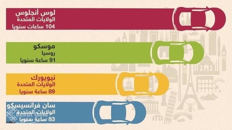 وجاء السائق في لوس أنجلوس أولا بإهدار ما يصل إلى 104 ساعات سنويا من وقته وحياته، ثم في موسكو، حيث يقضي السائق ما يصل إلى 91 ساعة عالقا وسط الزحام، أي أنه يتفوق على السائق في نيويورك بنحو ساعتين.
