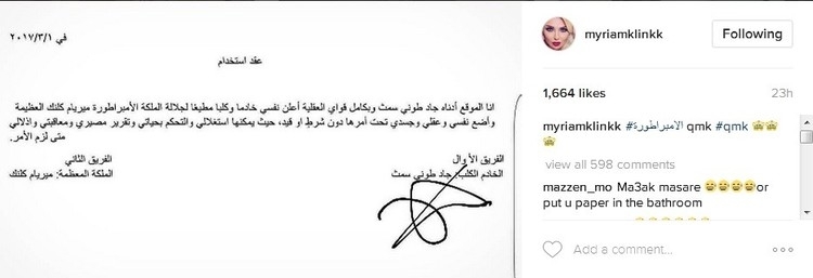 نشرت عارضة الأزياء ميريام كلينك عبر صفحتها الخاصة على تطبيق “إنستغرام ” صورة لعقد إستخدام أرسلها لها أحد الأشخاص.