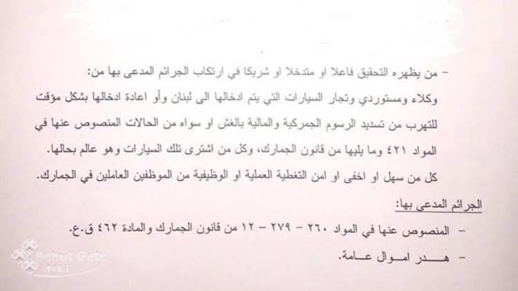 تقدم محامو مجموعة “الشعب يريد اصلاح النظام” : حسن بزي، وهاني الاحمدية،وجاد طعمة وعباس سرور، وبيار الجميل من مجموعة الشعب يريد إصلاح النظام بإخبار ضد مستوردي ووكلاء السيارات الفخمة وكل من يظهره التحقيق.