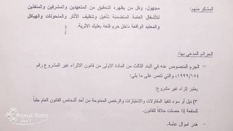 والإخبار الثاني تم توجيهه ضد مجهول وكل من يظهره التحقيق من المهندسين والمتعهدين الذين وبسبب عدم التزامهم بالأصول وسعيهم للإثراء غير المشروع تسببوا بتشويه وإلحاق الضرر البالغ غير القابل للمعالجة او الاصلاح بآثار ونقوش المعايد والهياكل ومنحوتات قلعة بعلبك عبر استخدام أشخاص لا يتمتعون بالخبرة واعتماد أدوات بدائية بدلا من الاستعانة بخبراء متمرسين في عملية ترميم الاثار وتأهيلها داخل حرم قلعة بعلبك ثاني رموز لبنان بعد الارزة التي تتوسط علمه.