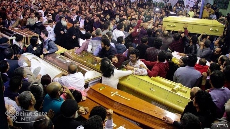 وعلا نحيب النساء لدى وصول التوابيت، التي نقش عليها كلمة “شهيد”، إلى كنيسة مار أمينة في مدينة الإسكندرية، الاثنين، في لقطات بثتها قنوات مصرية عدة.