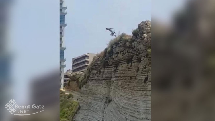 أقدم المدعو أحمد العلي، البالغ من العمر 18 سنة على القفز من أعلى نقطة مقابل صخرة الروشة في البحر من ارتفاع حوالي 35 متراً.