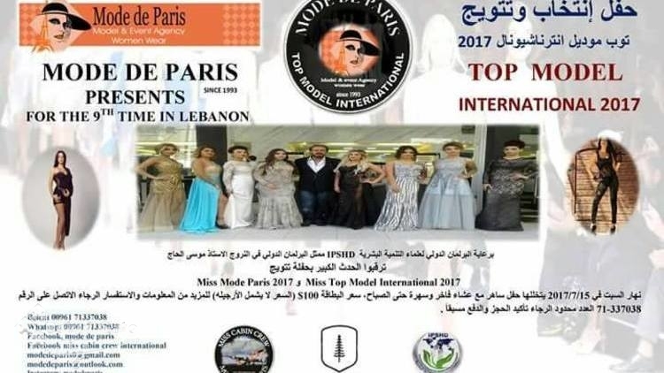 برعاية البرلمان الدولي لعلماء التنمية البشرية IPSHD وممثّل البرلمان الدولي في النروج الاستاذ موسى الحاج يتشرفون بدعوتكم لحضور حفل انتخاب وتتويج توب موديل انترناسيونال 2017 التي تُقام للسنة التاسعة على التوالي في لبنان وذلك نهار الخميس 15 تموز 2017.