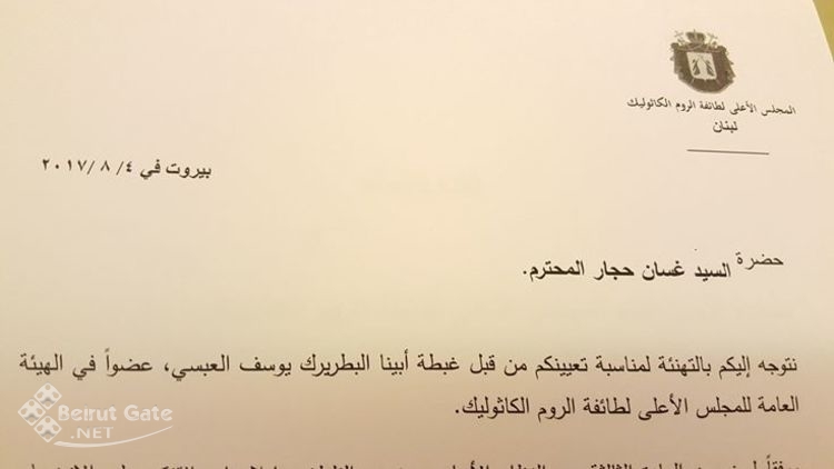 عيّن بطريرك الروم الكاثوليك يوسف العبسي مدير تحرير جريدة النهار الزميل غسان حجار عضواً في الهيئة العامة للمجس الاعلى لطائفة الروم الكاثوليك وذلك بتاريخ 4 آب 2017، كما وعيّن البطريرك لاحقاً رئيس تحرير موقع MTV الزميل داني حداد عضواً في المجلس الأعلى نفسه الذي يرأسه غبطته.