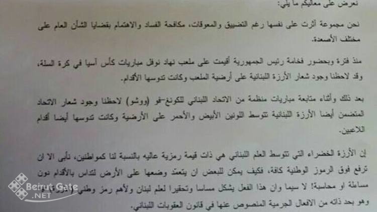 بعد استهتار الاتحادات الرياضية بوضع شعاراتها الشبيهة بالعلم اللبناني مع ارزته وقيام اللاعبين بالدعس والدوس على هذا الشعار بشكل مستفز للمشاعر الوطنية، تقدّمت مجموعة الشعب يريد اصلاح النظام بطلب من معالي وزير الشباب والرياضة لاصدار تعميم يمنع هذه الظاهرة على أمل أن تتم المعالجة قبل اللجوء إلى القضاء.