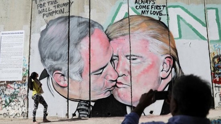 أكمل أحد الرسامين غرافيتي ساخر على الجدار العازل الإسرائيلي في الضفة الغربية يجسد “قبلة حارة” بين الرئيس الأميركي دونالد ترامب ورئيس الوزراء الإسرائيلي بنيامين نتنياهو.