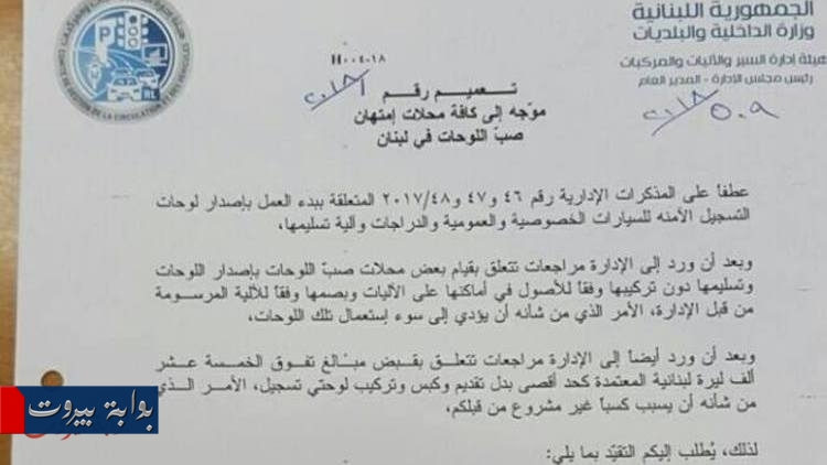 صدر عن وزارة الداخلية تعميم موجّه الى المحال المخصصة لصب لوحات السيارات في لبنان.
